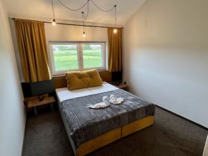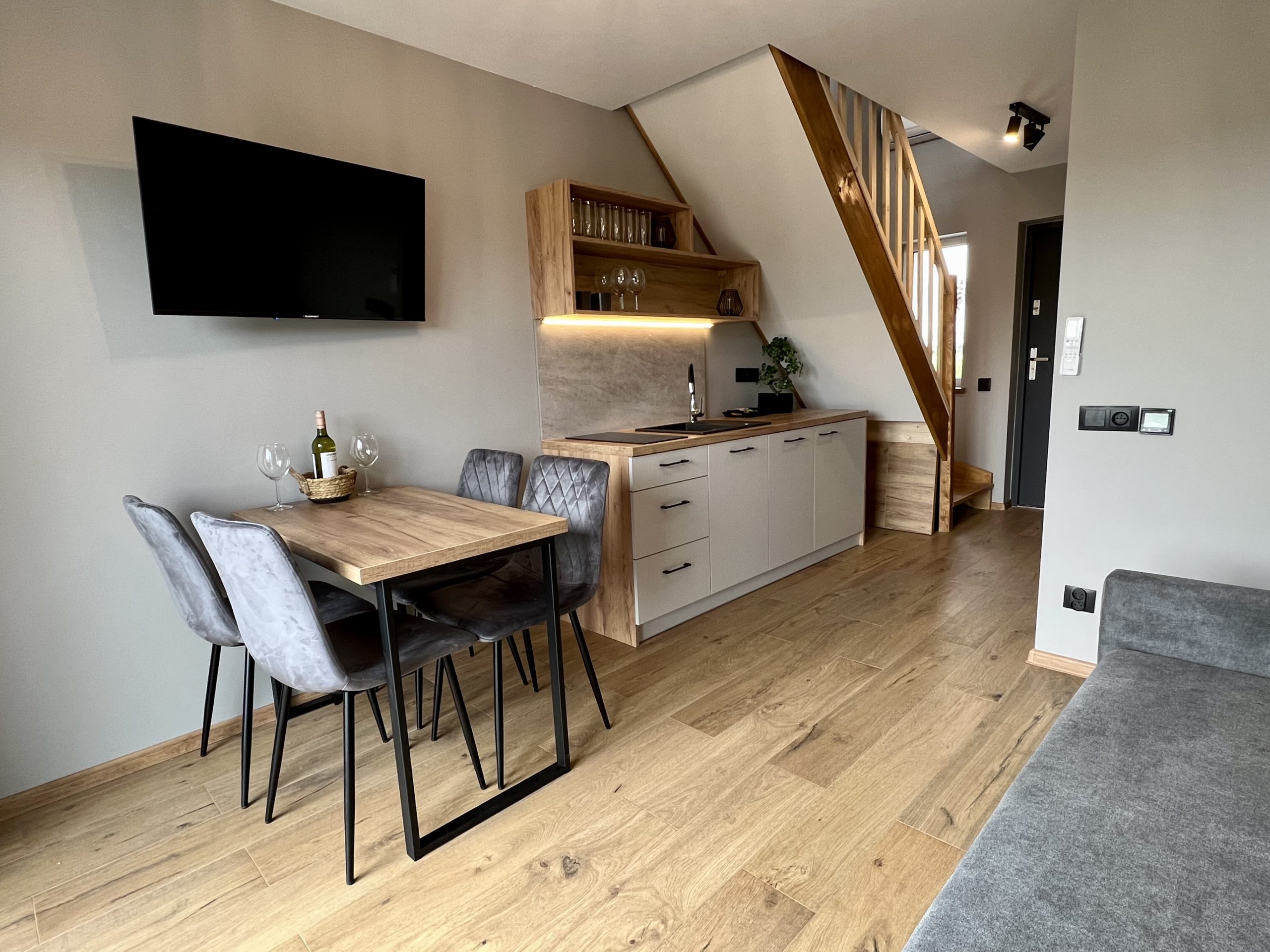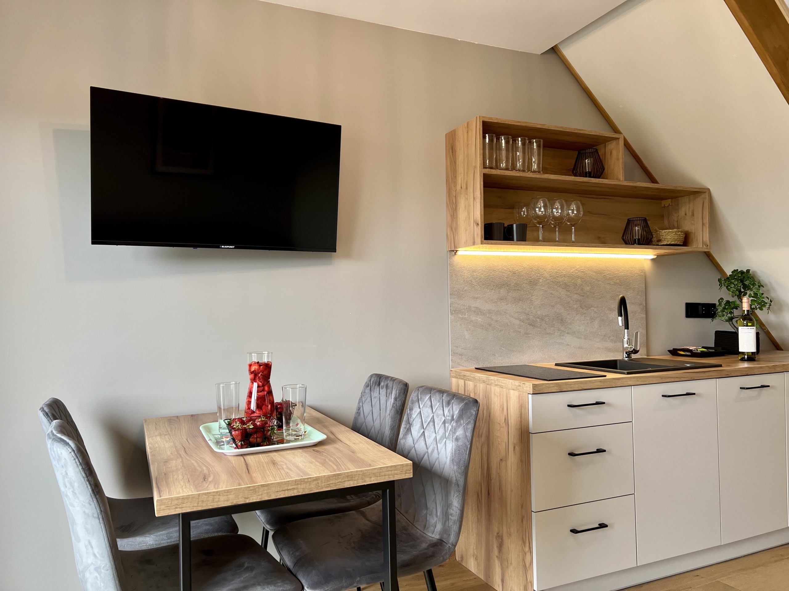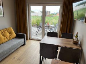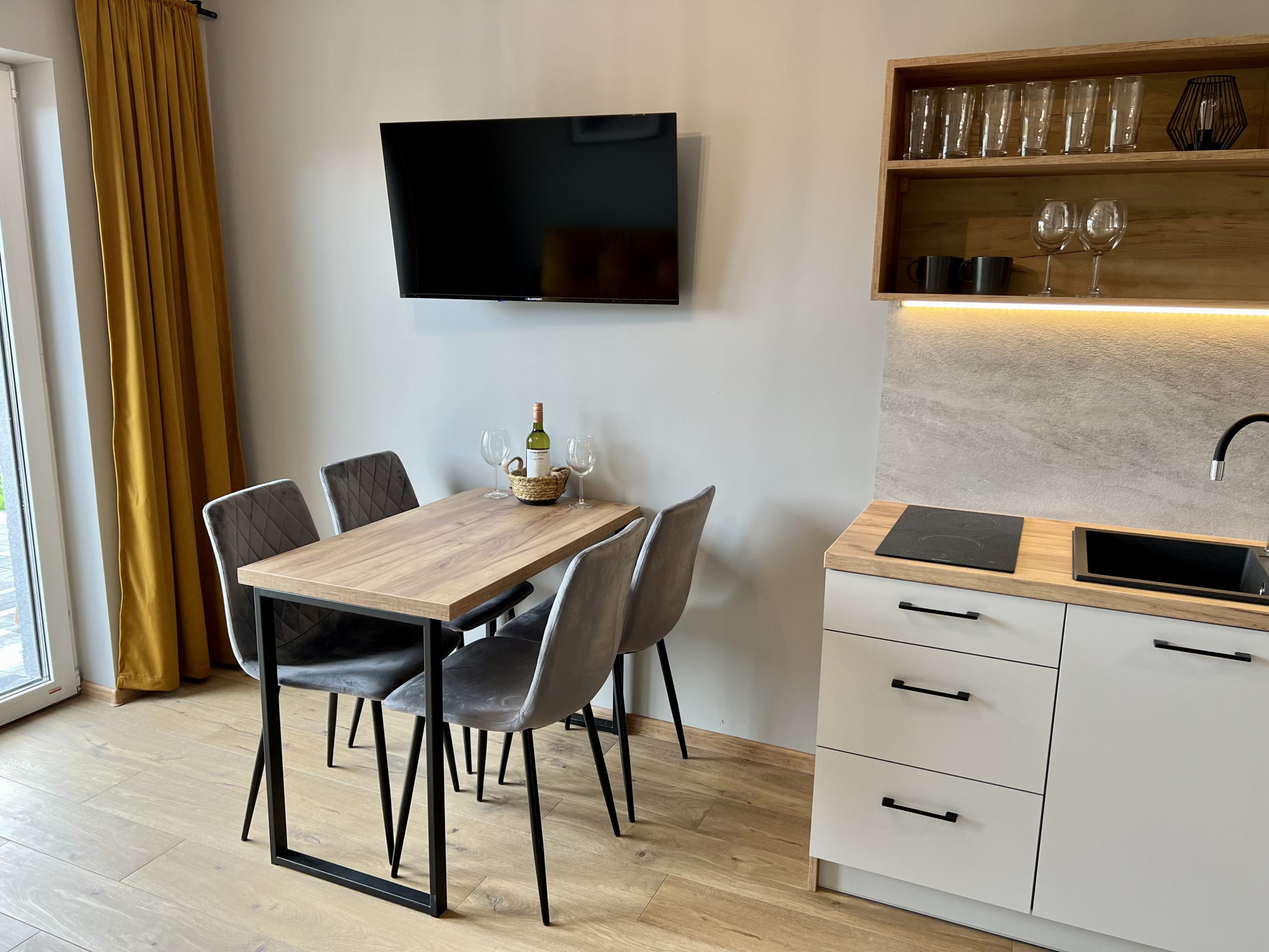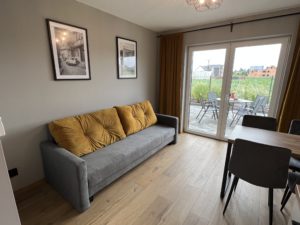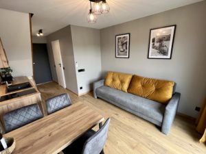 Nasze apartamenty są przestronne i funkcjonalne, zapewniając odpowiednią przestrzeń dla rodzin, par czy grup przyjaciół. Każdy apartament posiada wygodną sypialnię, salon z częścią wypoczynkową, a także pełni wyposażony aneks kuchenny. Możecie przygotować własne posiłki, korzystając z dostępnych udogodnień, takich jak kuchenka, lodówka, czajnik zmywarka i naczynia.